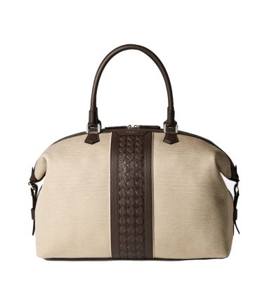The Serapian Travel Bag in Canvas and Mosaico blends relaxed texture with refined Italian craftsmanship. Made from durable natural canvas and trimmed with Espresso Cachemire leather, its sleek silhouette is accented by a central panel of Serapian’s signature Mosaico detailing. Spacious yet elegant, this versatile travel bag is perfectly sized for overnight trips and weekend escapes—an effortless companion for business travel, city getaways, or summer adventures.